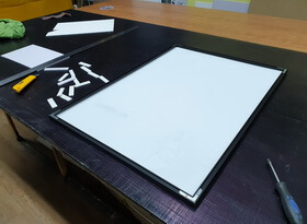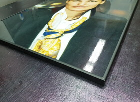 Затем из металлического профиля мы изготавливаем рамку, тыльную сторону которой закрывает прямоугольный белый фон. Распечатанный на плёнке портрет мы приклеиваем к вспененной основе для придания необходимого объёма и жесткости.
